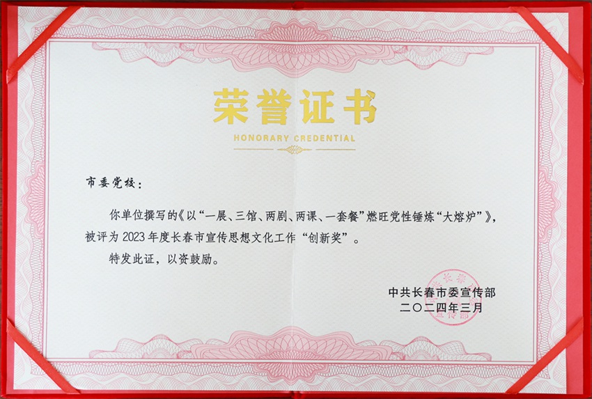 近日,中共長春市委黨校(長春市行政學院)報送的“以‘一展、三館、兩劇、兩課、一套餐’燃旺黨性錘煉‘大熔爐’”項目榮獲2023年度長春市宣傳思想文化工作“創新獎”,得到通報表揚。 2023年度長春市宣傳思想工作“創新獎”由中共長春市委宣傳部組織評選,基于2023年度全市宣傳思…