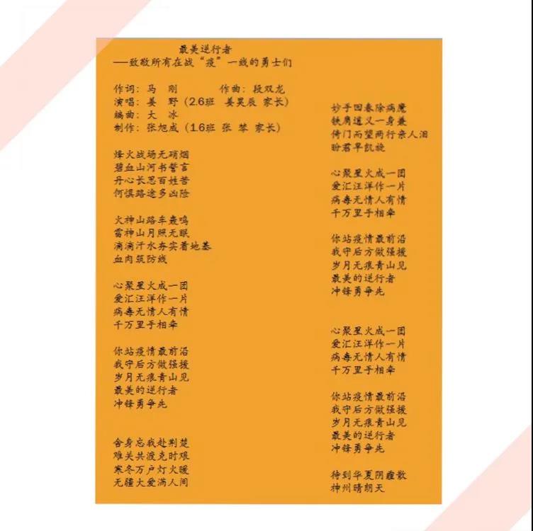 為體現八十七中中小學家校合作成果,段校長邀請大冰先生進行錄制伴奏;2年6班姜昊辰爸爸姜野先生在家利用簡單的錄音設備,反復錄唱;1年6班張棽爸爸張旭成先生也加入創編團隊,深入解讀歌詞內涵,積極搜集影像素材、補拍畫面、編輯視頻。終于推出這首弘揚中華民族堅不可摧的意志、歌頌眾多舍身忘我抗擊疫情偉大精神的《最美逆行者》。