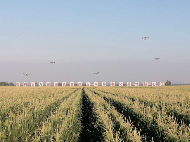 時值大暑,陽光明亮,天空湛藍,盛花期的玉米長勢喜人,綠葉沃若。十余架植保無人機正在盤旋作業。站在田邊的高臺上眺望,一望無際的綠色田野充滿生機與活力。