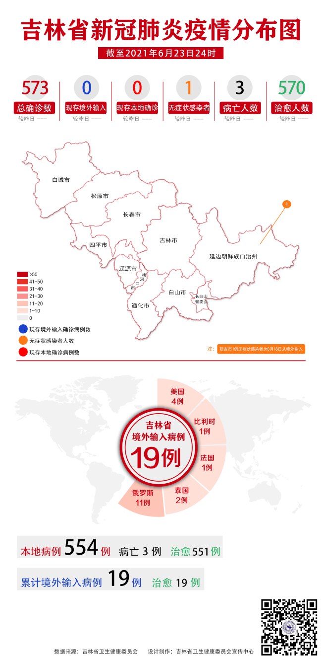 6月23日0-24時,全省無新增確診病例和無癥狀感染者。 提醒廣大公眾,當前“外防輸入、內防反彈”形勢依然嚴峻,近期我省對廣東省廣州市、深圳市、佛山市等疫情風險地區返(來)吉人員開展排查管控,請有關人員主動向當地社區報備,配合做好核酸檢測、居家健康監測等工作,如出現發熱、咳嗽等急性呼吸道癥狀,請佩戴醫用口罩及時到當地定點醫療機構發熱門診就診。接種新冠疫苗是預防新冠肺炎的有效措施,請廣大群眾主動盡早接種,大家要樹牢常態化防控意識,堅持外出戴口罩、勤洗手、常通風、保持社交距離、不聚餐、不聚集,減少疾病感染風險。(吉林省衛生健康委員會)