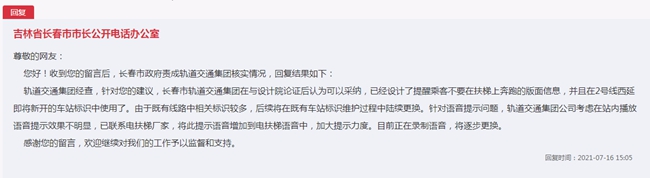收到留言后,長春市政府責成軌道交通集團核實情況并回復:將組織修訂“電扶梯乘客須知”及站內語音播報內容,增加禁止在電扶梯上行走或奔跑的內容,預計在2021年3月完成標識修改工作、語音錄制及系統輸入工作。同時將由相關部門組織專項宣傳活動,倡導乘客不要在電扶梯上行走或奔跑,要求軌道交通集團公司站務人員發現乘客在電扶梯上行走或奔跑的情況,立即勸阻。
