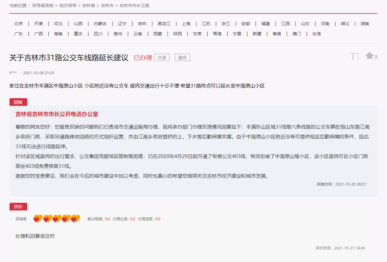 針對該網友提出的問題,吉林市市長公開電話辦公室回復說,針對該區域居民的出行需求,公交集團克服場區限制等困難,在2020年4月29日起開通了街巷公交403線,有效銜接了中海原山等小區,該小區居民可在小區門前乘坐403線免費換乘31線。對此,該網友表示處理和回復很及時,在評價一欄給出五心好評。