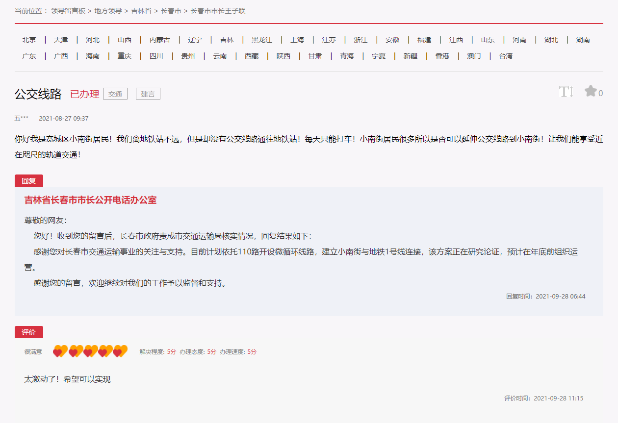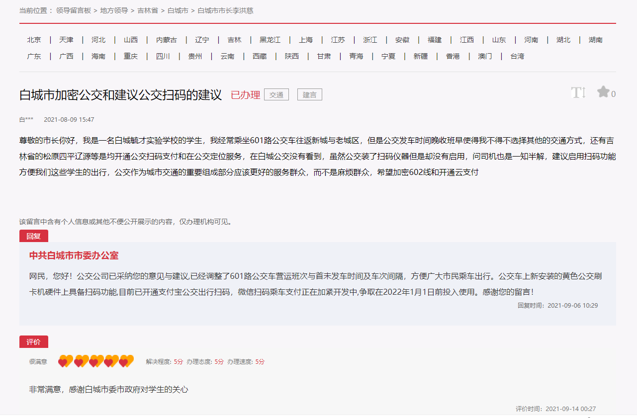 “非常滿意,感謝白城市委市政府對學生的關心!比涨,吉林省白城市一網友在人民網“領導留言板”上的留言“建議加密公交和開通公交掃碼支付”獲回復,網友表示非常滿意并給出五心好評。