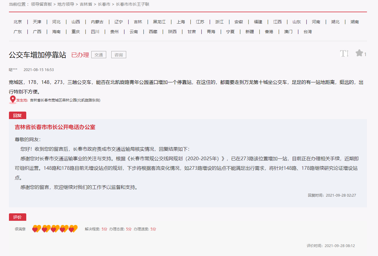 “根據《長春市常規公交線網規劃(2020-2025年)》,已在273路該位置增加一站,目前正在辦理相關手續,近期即可組織運營!9月28日,長春市政府責成市交通運輸局核實情況后回復網友留言表示,如273路增設的站點不能滿足出行需求,下步將根據客流變化情況,針對148路、178路繼續研究論證增設站點。