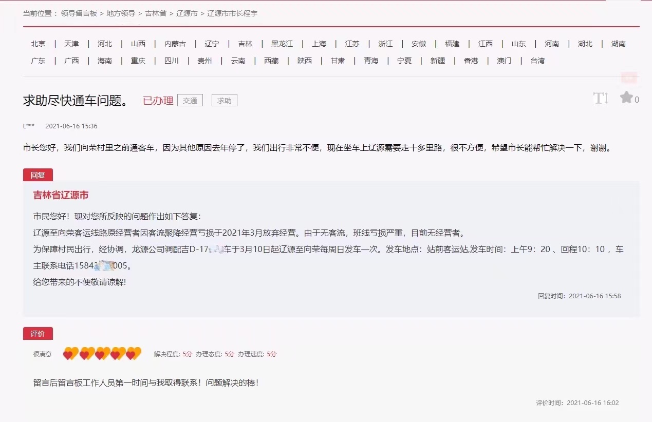 今年6月16日,吉林省遼源市一網友給遼源市市長留言說,我們向榮村里之前通客車,因為其他原因去年停了,我們出行非常不便,現在坐車去遼源需要走十多里路,很不方便,希望市長能幫忙解決一下。