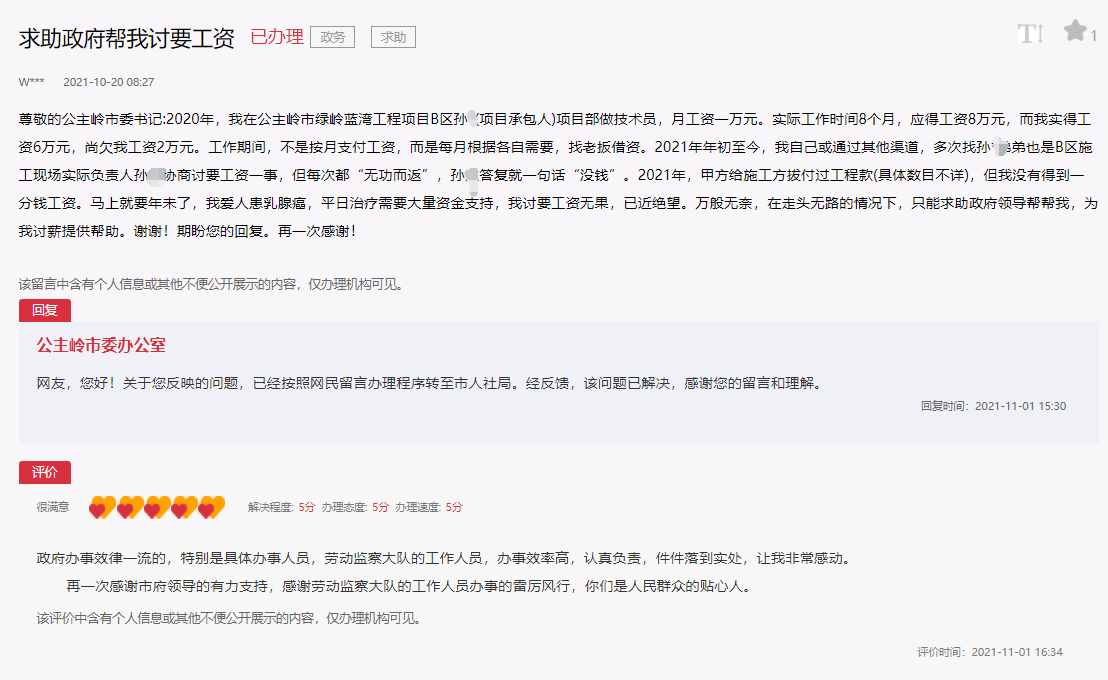 11月1日,公主嶺市委辦公室回復網友留言,“您好!關于您反映的問題,已經按照網民留言辦理程序轉至市人社局。經反饋,該問題已解決,感謝您的留言和理解!苯浌鲙X市人社局協調,網友拿回了被拖欠的工資。