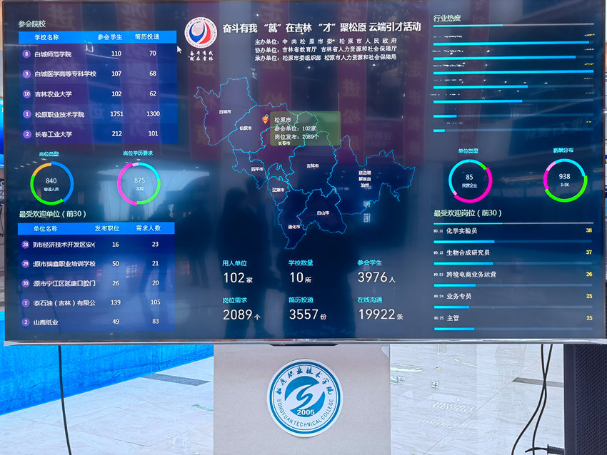 據悉,本次活動共吸引來自松原地區的102家用人單位、省內10所高校的4078名畢業生參會,共提供崗位2089個,畢業生在線投遞簡歷3802份,與用人單位在線溝通交流20095條,線上達成就業意向128人,線下達成就業意向協議156人,通過網絡觀看直播人次超過3萬人。