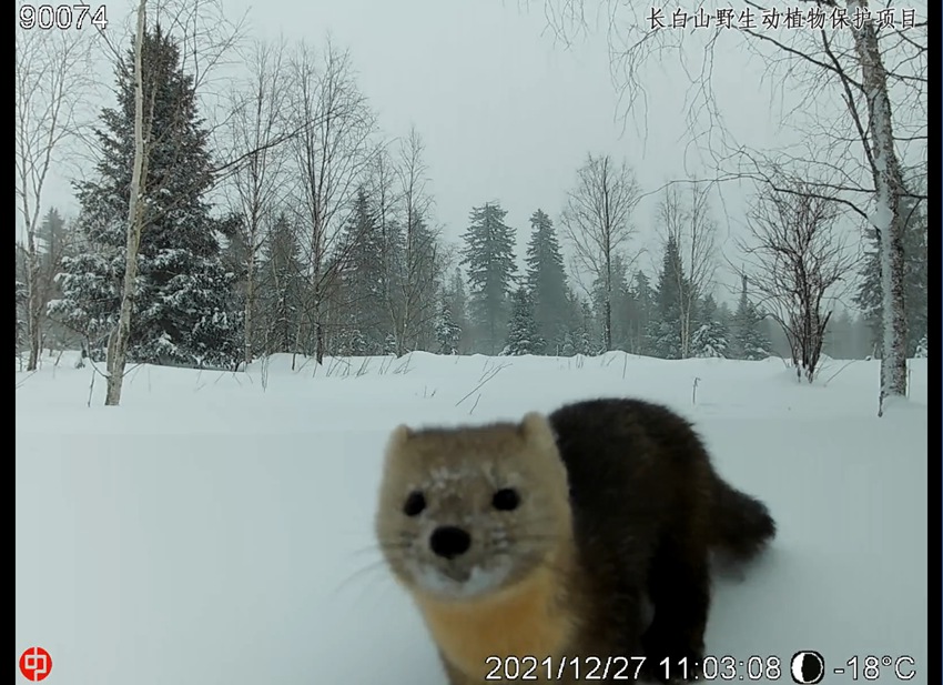 2021年12月27日,在吉林長白山國家級自然保護區(吉林省長白山保護開發區下轄自然保護區)橫山保護站,無線傳輸的紅外相機捕捉到了一個可愛身影:毛茸茸的臉上粘著白雪,好奇地看向鏡頭。它就是國家一級保護動物——紫貂。據長白山國家級自然保護區管理局工作人員張榮杰介紹,這是本月內第二次拍到紫貂,“黑熊、馬鹿我們也經常能看到,夏天還能看到中華秋沙鴨呢!”