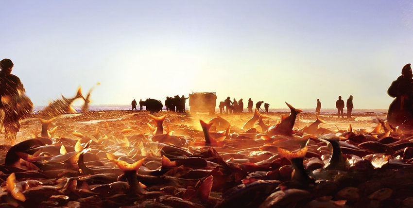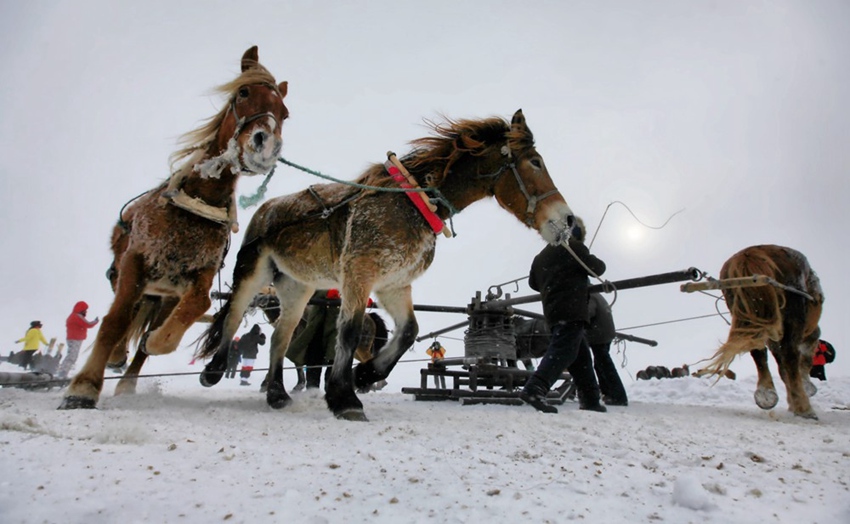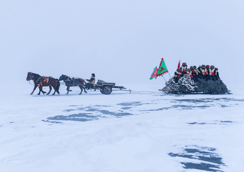 出網,依靠馬拉絞盤。4匹健碩的馬兒拉著絞盤打轉,馬蹄踏雪,漁網破冰,緩緩而出。萬尾鮮魚破冰而出,冒著“熱氣”冰上勁舞。