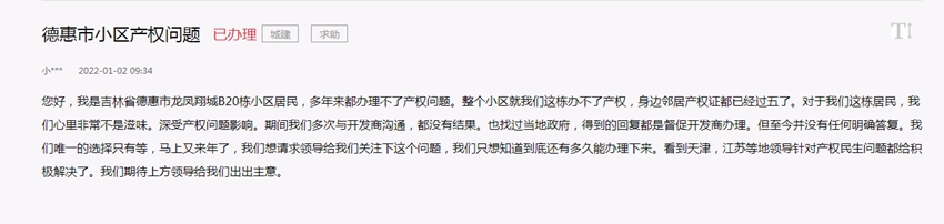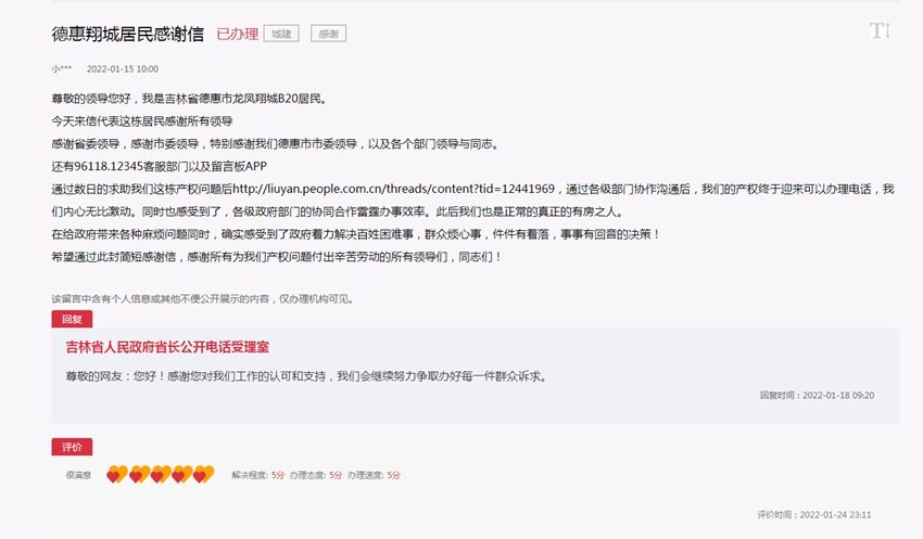 急難愁盼丨吉林德惠:盼了多年的產權辦理有著落!網友發來感謝信