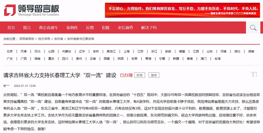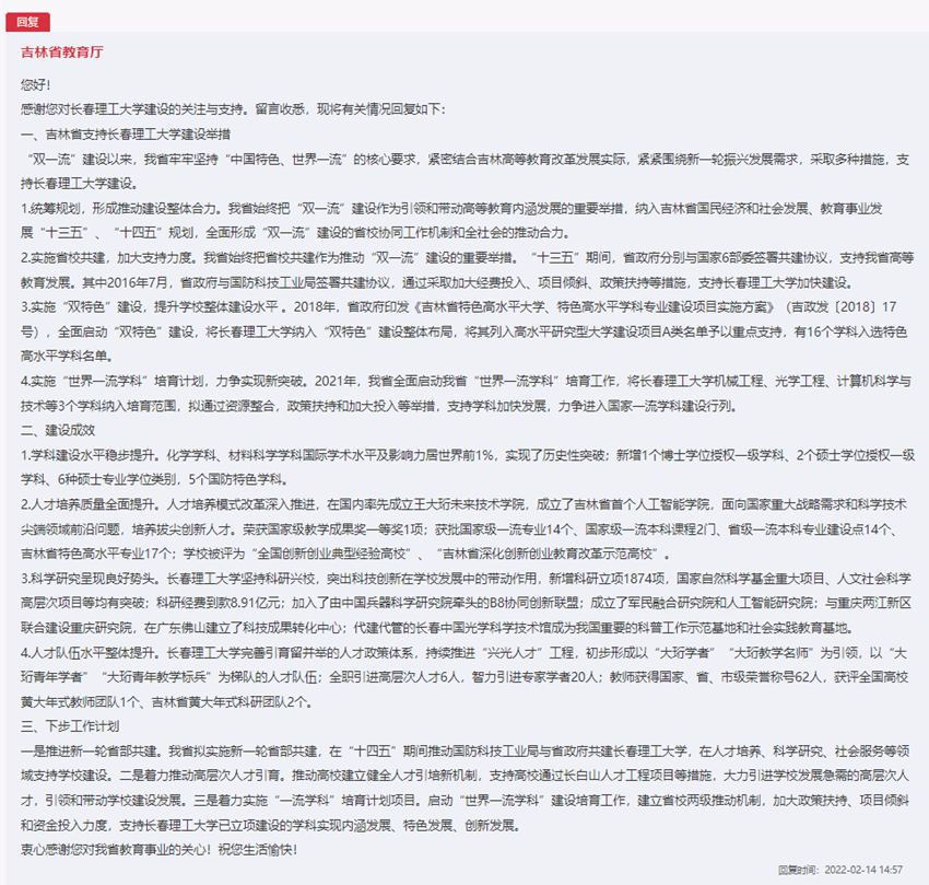 吉林省教育廳回復了網友的留言,并對吉林省高校建設工作進行了詳細闡述。