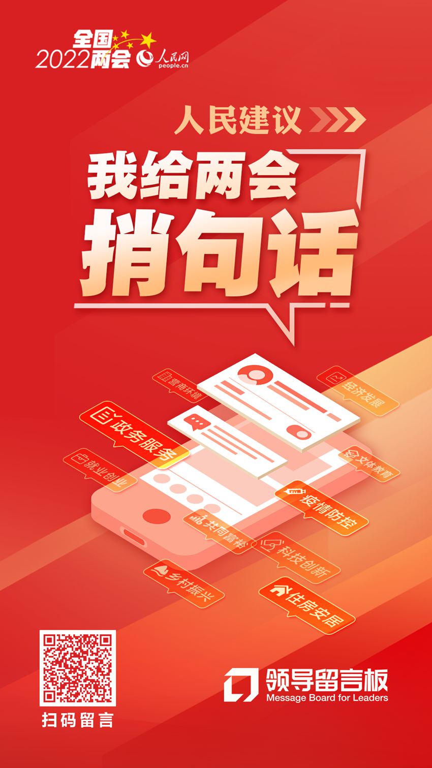2022年全國兩會將于3月召開,日前,人民網“2022年我給兩會捎句話”活動已經正式啟動,面向社會各界征集建議。歡迎到“捎句話”活動里提出您的建議,為家鄉的繁榮與國家的發展建言獻策。