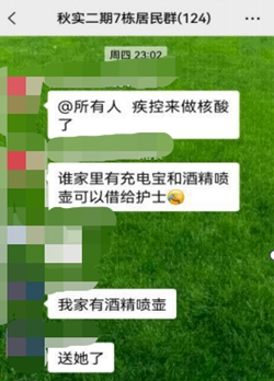 人民網長春3月28日電 (王海躍)“疾控來人做核酸了,誰家里有充電寶和酒精噴壺可以借給護士?”3月24日晚11點,長春市疾控中心醫護人員結束上一段工作后馬不停蹄趕到秋實e景二期小區,上門給7棟(封控樓)居民做核酸。一整天工作下來,醫護人員酒精噴霧不夠用了,這可怎么辦?為了不耽誤核酸檢測,繁榮社區秋實e景二期七棟網格長在居民群發出了求助信息。