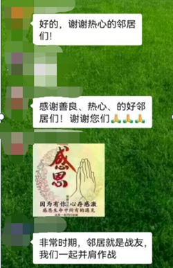“一單元的鄰居們,保持好心態,如有需要可以幫助!薄胺浅r期,鄰居就是戰友,我們一起并肩作戰!薄咔閬砼R,他們互相支持,加油鼓勁。