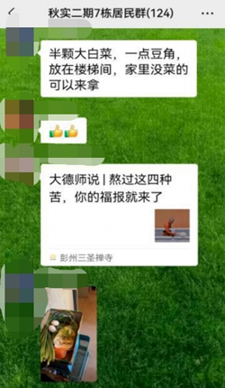 “半顆大白菜和一點豆角放在樓梯間了,家里沒菜的可來拿!薄皠偵玫木G豆芽,誰需要?”“我公司開超市,有蔬菜、水果、生活用品,如果菜不夠,我可以幫著聯系統一送過來”……食材緊缺,他們互相幫忙,克服困難。