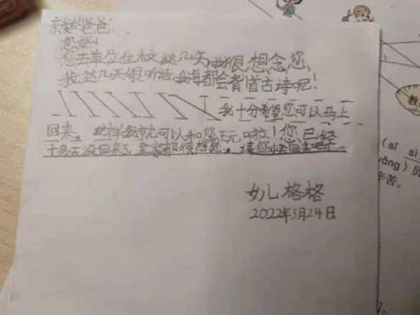 這是機械與控制工程學院黨總支副書記宋啟明的女兒格格給爸爸寫的一封信,已經許久未見到親愛的爸爸,她用稚嫩的筆跡,天真、樸素、動情的話語,訴說著女兒和全家人的牽掛。