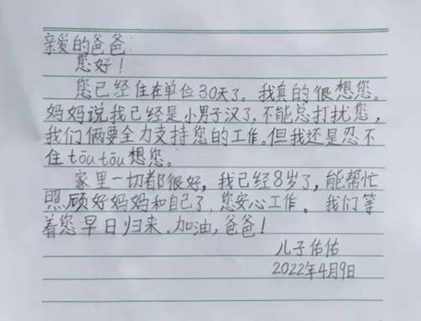 這是政法學院黨總支副書記李智仁的兒子寫給父親的一封信,已經30天未見到爸爸,佑佑第一次和爸爸分開這么長時間,數日不見,已經成為小小男子漢,爸爸在外做學子的守護者,佑佑在家為媽媽撐起一片天!