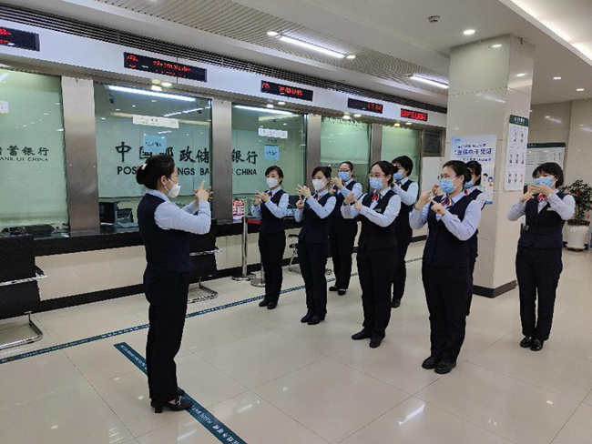 西寧大路支行利用晨會、夕會時間,組織全體支行人員學習基礎手語、文明服務十字用語等。邀請了專業手語老師,配合日常網點服務需求,有針對性地開展銀行服務特色手語指導,并梳理總結了從廳堂引導到柜面服務的簡單文明用語話術,讓客戶感受更有溫度的金融服務。