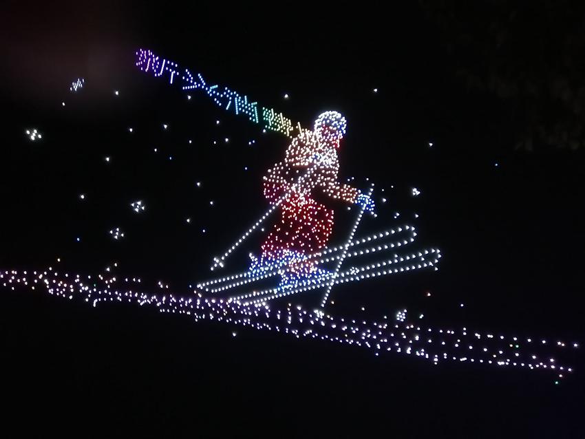 8點整,夜空被一束束燈柱劃破,伴著激昂的音樂,2022架無人機的隊形變幻在燈光變化中一一呈現,代表生命希望的種子、向前滑雪的運動員、環繞地球的“吉林一號”衛星,在觀眾的聲聲驚嘆中依次閃耀。