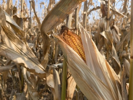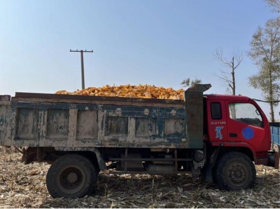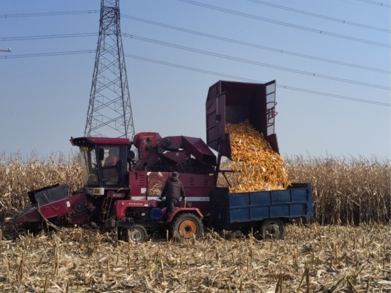 在長春市農安縣楊樹林鄉偏坡子村,伴隨著農機的陣陣轟鳴聲,近三米高的玉米秸稈被粉碎,一顆顆玉米被剝離運輸,運向不遠處的烘干塔。
