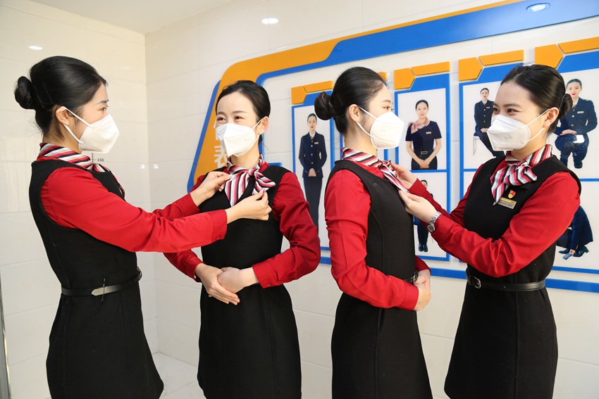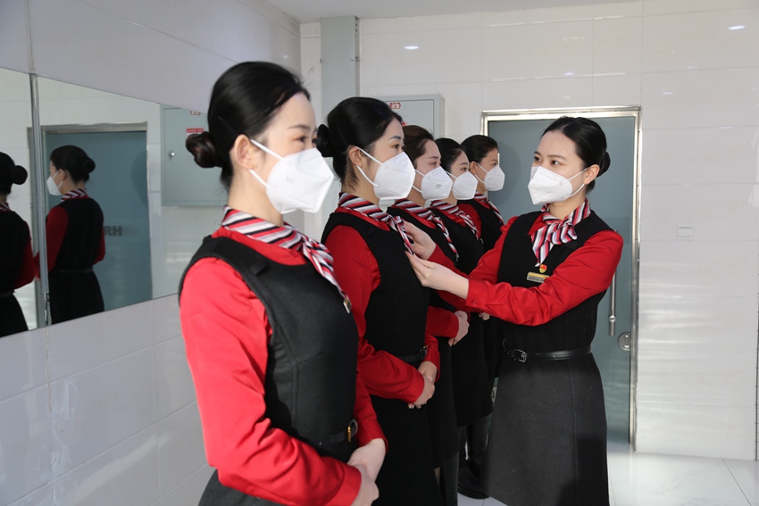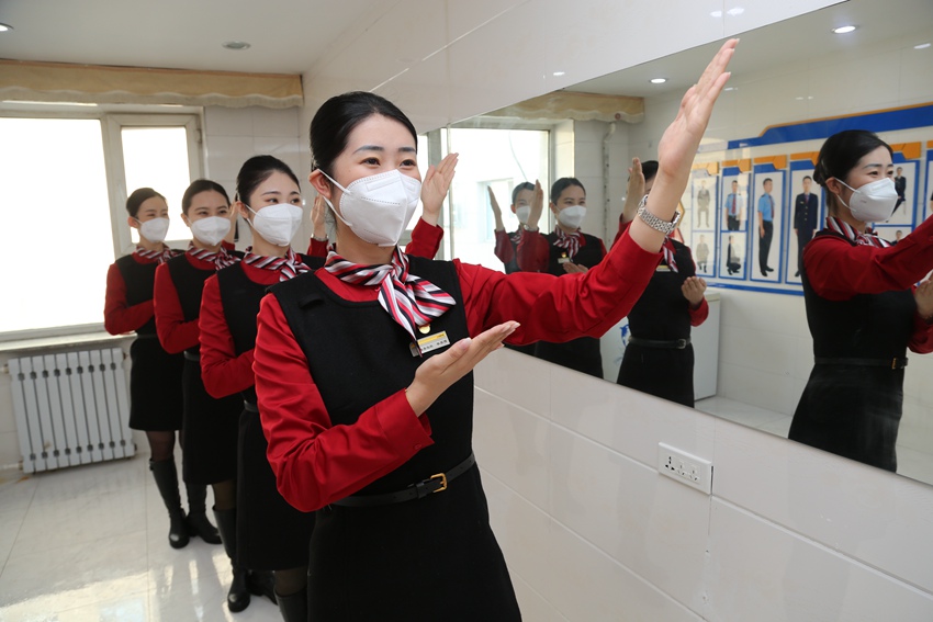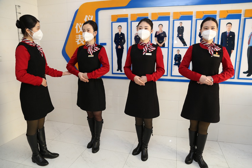 春運大幕即將開啟,為了讓旅客出行體驗更美好,中國鐵路沈陽局集團有限公司組織客運系統職工開展集中培訓,通過基礎業務、服務禮儀的學習以及應急模擬演練、實作考評等方式,不斷提升客運服務水平,全力迎接春運“大考”。圖為 2023年1月5日,中國鐵路沈陽局集團有限公司長春客運段乘務員在形體房進行服務禮儀培訓。(李季春 崔凱)