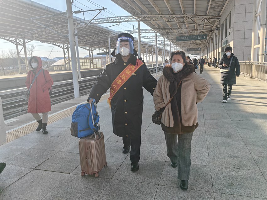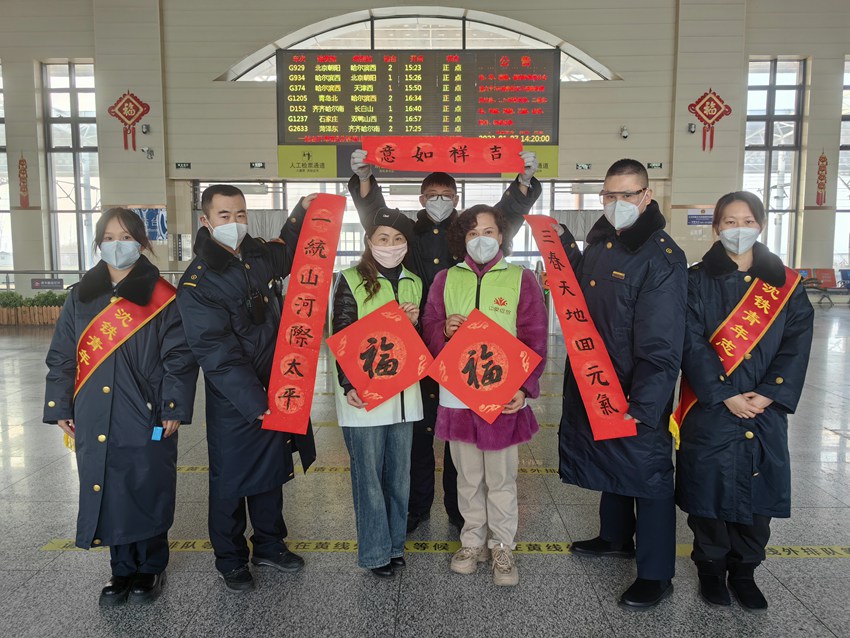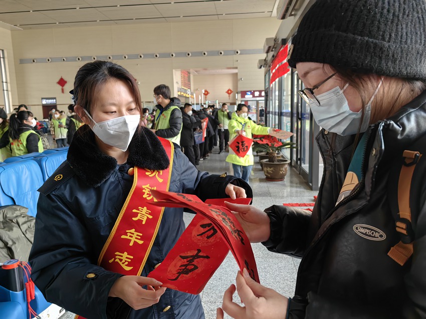 同時,長春車務段團委組織青年志愿者們熱情服務重點旅客,幫助旅客提拿行李,引導旅客購票等,長春車務段管內公主嶺、扶余北等客運站也同步開展了為旅客送春聯、送祝?;顒?。