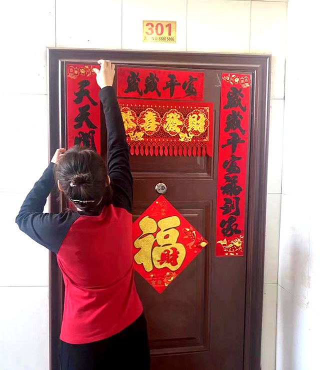 王寶成的妻子在貼春聯。(受訪者供圖)