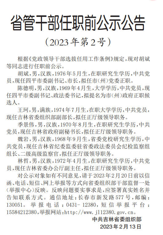 吉林省管干部任職前公示公告(2023年第2號)