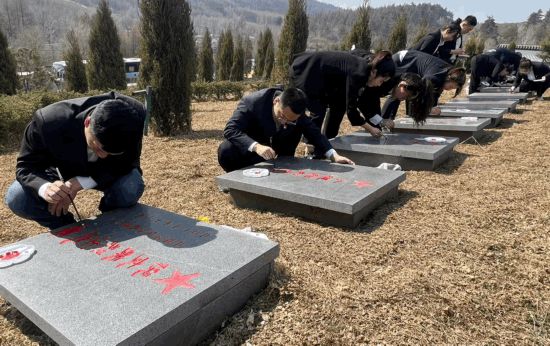活動中,全體人員奏唱《中華人民共和國國歌》,在烈士碑前鞠躬默哀,重溫入黨誓詞,瞻仰烈士紀念碑等。儀式結束后,大家來到陵園墓區,俯身烈士墓碑前,細致擦拭墓碑上的灰塵,對風化褪色的銘文碑文進行描摹填漆,以實際行動表達對革命先烈的崇敬之情。