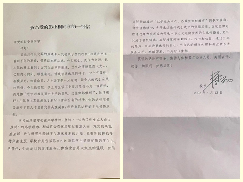 秦和校長在信中說:“人生并不是一片坦途,每個人的成長會哭泣悲傷,會無助孤寂,真正的堅強不是面對悲傷不流一滴眼淚,而是擦干眼淚后微笑面對生活的勇氣,這些你都做到了,做得很好!在你身上真正展現了新時代青年應有的樣子,你的這些寶貴品質與學校人才培養定位高度契合,我為有你這樣的學生倍感欣慰……”她還鼓勵小桐,通過三年的努力,會成為更優秀的自己。