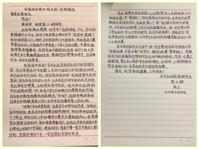 小桐給秦和校長的回信中說道:當兩位老師告訴我,我在吉外的學費全部免除時,我的爺爺奶奶流下了熱淚,同時無形之中好像有力量充斥著我的內心……吉外的愛跨越千山萬水,到達了我的家鄉貴州畢節,深深地溫暖了我和我的家人們。同時,吉外的老師們代表校長,向我送來了最真摯的關懷。與困難作斗爭是我二十多年人生的主題,失落與孤寂常常伴隨著我,而您在信中鼓勵的話語,給予了我無窮的勇氣與力量繼續面對生活,感謝您的贊賞和肯定……我在千里之外的貴州仿佛感覺到您就站在我的身邊拍著我的肩膀說“加油!”。