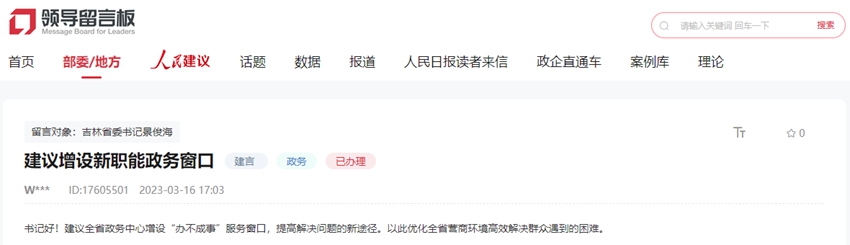 人民網長春4月17日電 (王海躍)提升服務效能是優化營商環境的重要一環。日前,網友在人民網“領導留言板”給吉林省委書記留言,建議全省政務服務中心增設“辦不成事”服務窗口,提高解決問題的新途徑,以此優化全省營商環境,高效解決群眾遇到的困難。