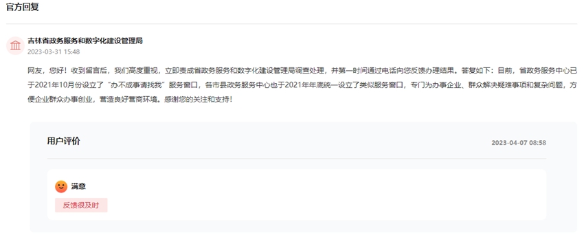 吉林省政務服務和數字化建設管理局調查處理,并第一時間通過電話向網友反饋辦理結果。