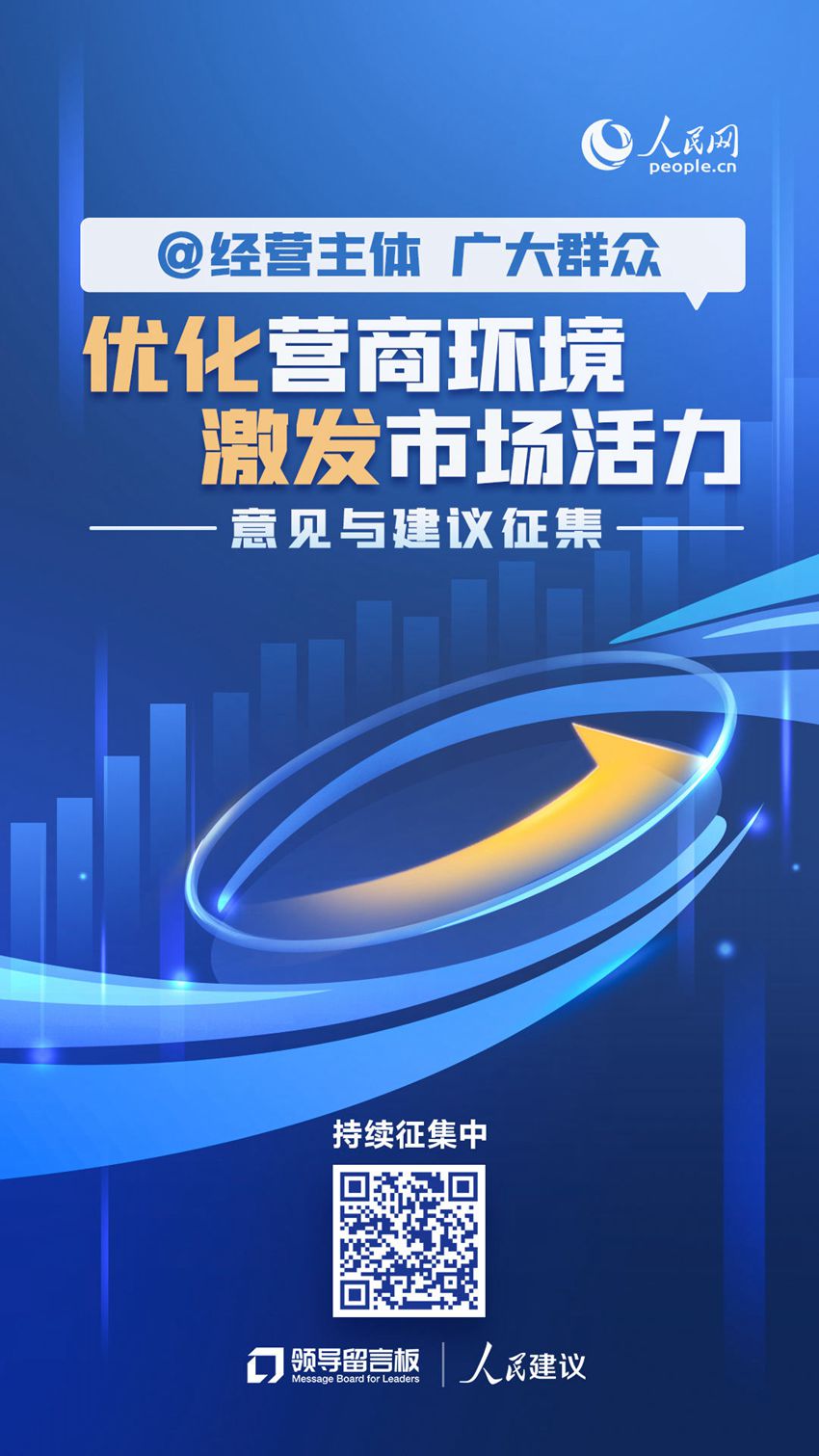 好的營商環境就像陽光、水和空氣,對經營主體而言須臾不可缺少。怎樣更好激發市場活力,您哪些問題亟待解決,歡迎來人民網“領導留言板”說一說!