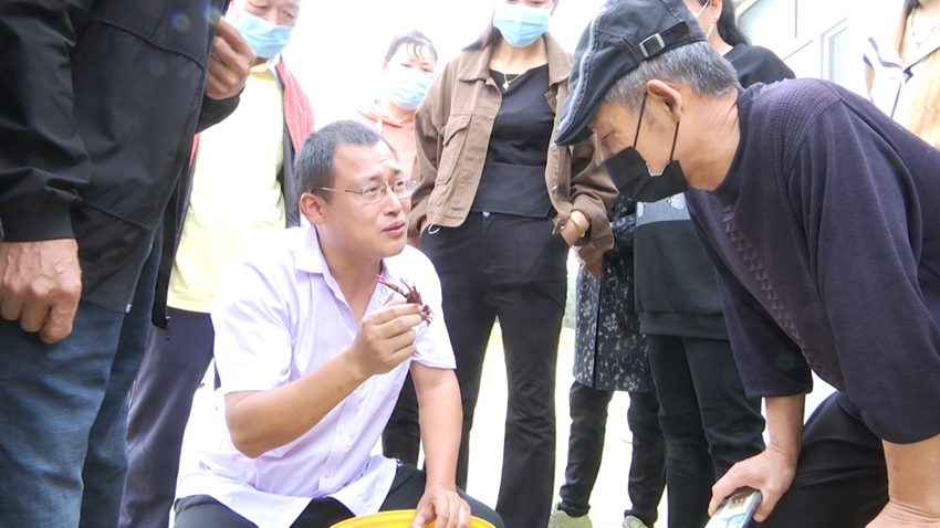 公主嶺稻漁科技小院教師正在給農民朋友們分享如何分辨雌雄小龍蝦的方法