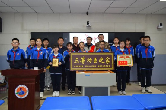 4月17日,蛟河市退役軍人事務局聯合市人武部來到三等功臣徐策父親工作所在學校,開展“喜報進校園·國防教育進課堂”主題活動,為徐策父親送去立功喜報、慰問金和功臣牌匾,讓師生同感軍屬榮光,宣揚“一人當兵全家光榮,一人立功全家榮耀”的榮譽氛圍,引導青少年樹立尊崇軍人的良好風尚。