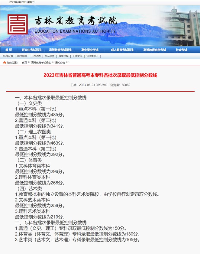 2023年吉林省普通高考本??聘髋武浫∽畹涂刂品謹稻€公布