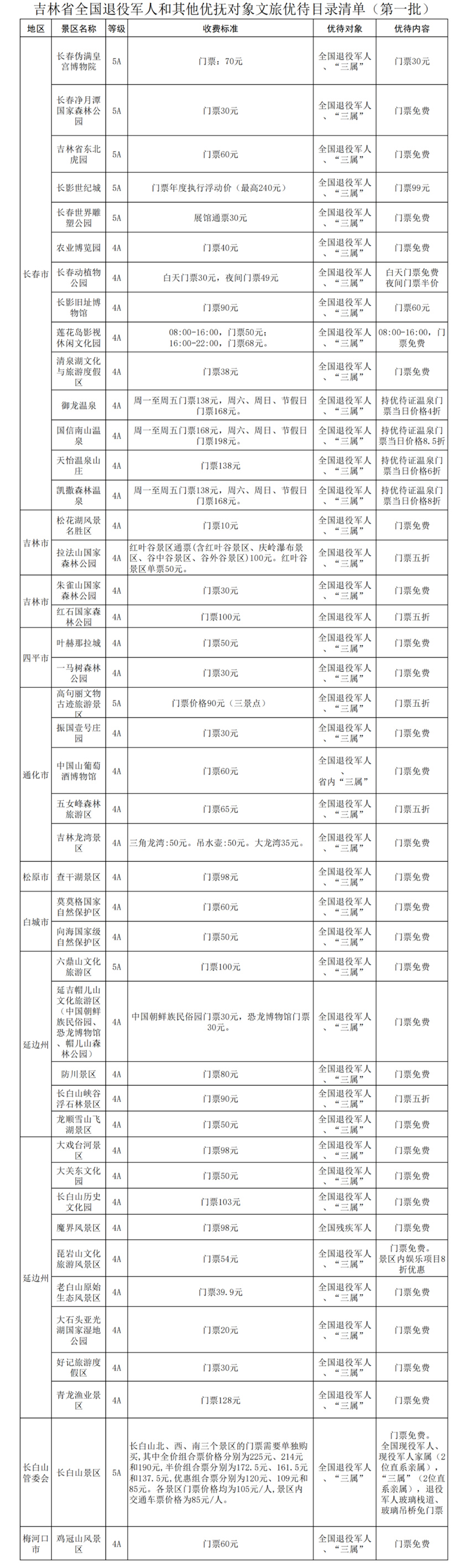 現將吉林省全國退役軍人和其他優撫對象文旅優待目錄清單(第一批)公布如下。