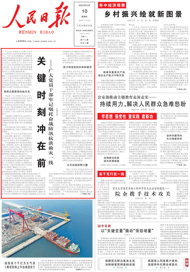 人民日報頭版頭條:廣大黨員干部牢記囑托奮戰防汛抗洪救災一線