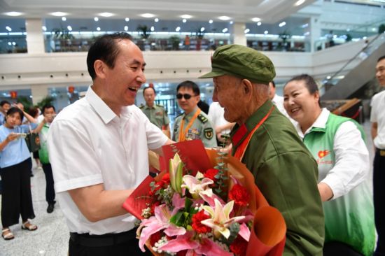 省退役軍人事務廳廳長萬春江看望參加開幕式的97歲老兵李金福