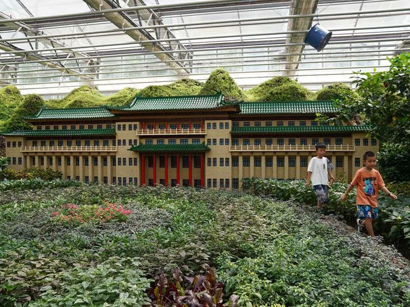 “景觀小品大多數以生姜擺放出的假山為背景,配以各色植物拼湊搭配的瑰麗風景,許多標志性建筑和造型都是用五谷雜糧粘貼?!闭箯d負責人王偉介紹,他們還運用了扦插、雕刻、繪畫等創意農業手法展現主題展板的深刻內涵。