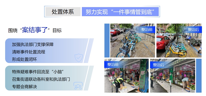 依托“城市眼·云共治·小河網驛”平臺,整合三支隊伍“手腳”,健全街道與職能部門之間、街道科室與社區之間的聯合處置機制,解決了一批以前“想管但管不了”“能管但管不好”的問題,提升社會事件處置和應急處突任務處置效能。一是在指揮體系上,實現“一個街腦管全域”。通過“城市眼·云共治·小河網驛”平臺,將違規事件實時告警圖片第一時間推送至網格員,由網格員提醒商家進行自改。對于整改不力的,流轉至對應片區共治隊員,由其現場處置后進行核銷;對于無法協調處置的,流轉至片區執法隊員,由執法力量跟進,實現閉環管理,扭轉“條塊”職能分散、力量分化現象。二是在運轉體系上,實現“一支隊伍管全部”。在片區內以道路為最小作戰單元,每條道路明確責任班組和包干隊員,實行24小時三班運轉。堅持平戰結合、快速轉換。平時狀態定人、定時、定崗、定責,有序開展護校安園、街面序化、店鋪巡查等工作;戰時狀態立即投入應急處突,1分鐘響應啟動、3分鐘到場處置、5分鐘增援力量協同作戰,對事項進行快速處置。截至2022年9月23日,共參與110接處警920余次,實現矛盾糾紛化解率上升30%,重復報警同比下降12%,環比下降21.8%。三是在處置體系上,實現“一件事情管到底”。針對城市管理、市場監管、生態環境保護、文化市場、交通運輸、應急管理、衛生健康等領域的典型案件,形成標準化處置流程,有效增強部門與街道聯動的協作粘性和反應速度。如針對店鋪巡查,打破各部門各管各查、信息不連通的溝通壁壘,改為由街道綜合行政執法隊牽頭,共治大隊配合,對所有店鋪實行整體查一次,從而實現信息互通、協同高效的閉環處置。在前期試行中,實現巡查次數降低46%,發現處置整改數量提升12%的效果。