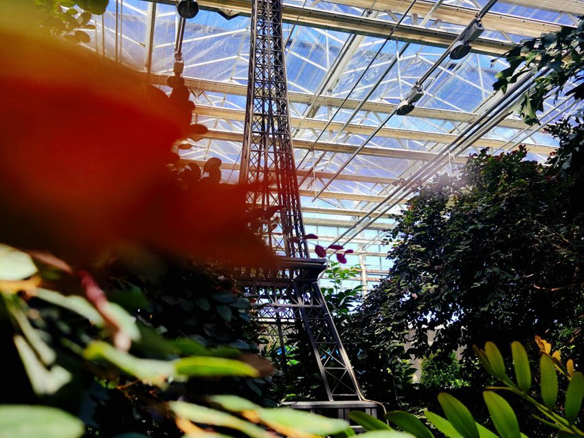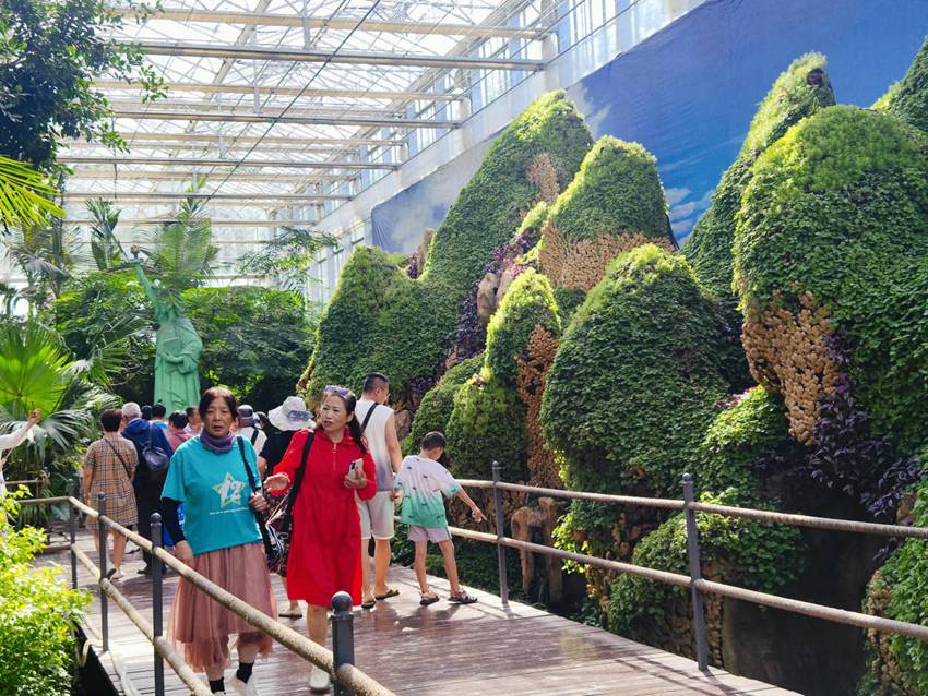 從高大的芭蕉葉下穿行,陽光透過棕櫚葉的縫隙一縷一縷地灑在地上,看埃菲爾鐵塔、自由女神像和歐洲城堡點綴其中,跟著標志牌一起了解食蟲植物的習性……僅在一個展廳就能看到五大洲的代表性植物和標志性的微縮景觀小品,這里就是長春農博會世界風情園。