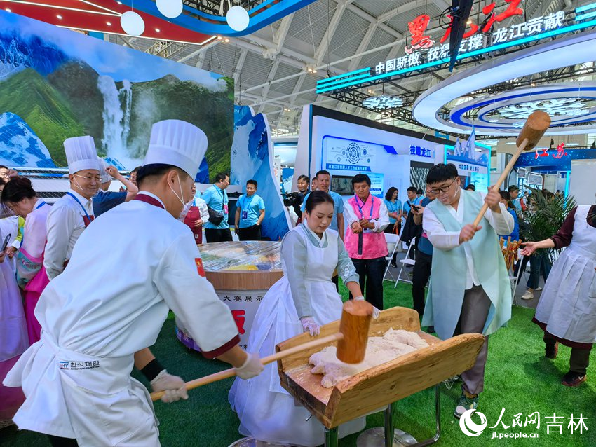 “一、二,一、二……”伴隨著激昂的口號聲,吉林展區內兩位身著朝鮮傳統服飾的工作人員向觀眾展示著朝鮮族打糕飲食文化,“打糕是已經熟的了,我們需要做的就是給它打黏,再蘸上豆面,就可以吃啦!”負責打糕的工作人員說。