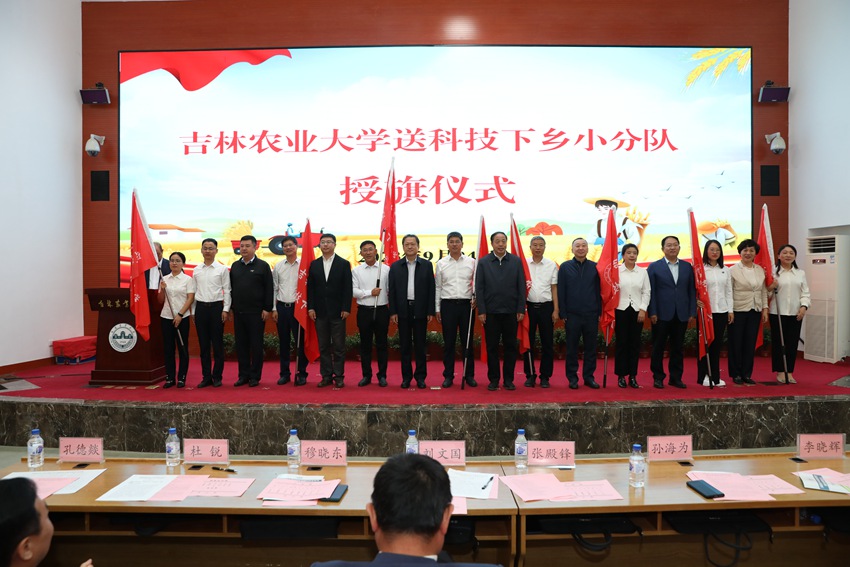 在豐收節期間,吉林農業大學應吉林省農業農村廳下發的文件精神,組建了8支送科技下鄉小分隊到全省各地開展科技服務,助力農民豐收。授旗儀式環節,省農業農村廳、省教育廳、省科學技術廳、省科學技術協會、省鄉村振興局、長春市科技局、凈月高新技術產業開發區為學校8支送科技下鄉小分隊代表授旗。
