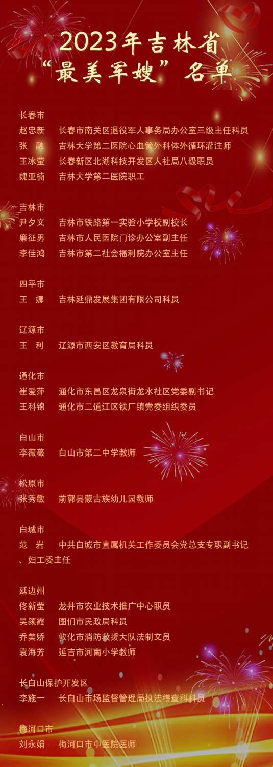 為深入學習貫徹黨的二十大精神和習近平總書記關于雙擁工作的重要論述,紀念延安雙擁運動80周年,繼承發揚延安雙擁運動光榮傳統,進一步營造關心國防、關愛軍屬的良好氛圍,10月8日,吉林省退役軍人事務廳、吉林省婦女聯合會、中共吉林省委宣傳部、吉林省軍區政治工作局聯合在長春舉行2023年吉林省"最美軍嫂"發布儀式。中共吉林省委宣傳部副部長張志偉,吉林省婦女聯合會主席王萍,吉林省退役軍人事務廳廳長萬春江、副廳長王繼才,吉林省軍區政治工作局大校副主任劉偉,吉林省婦女聯合會副主席呼志輝,長春市婦女聯合會主席叢中梅等領導參加發布儀式并為當選的"最美軍嫂"頒發獎章和證書。