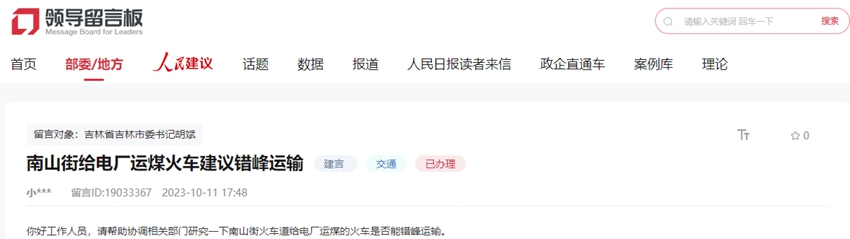 人民網長春10月18日電 (記者王海躍)“你好工作人員,請幫助協調相關部門研究一下南山街火車道給電廠運煤的火車是否能錯峰運輸?!?0月11日,吉林省吉林市網友在“領導留言板”給吉林市委書記留言,提出建議。