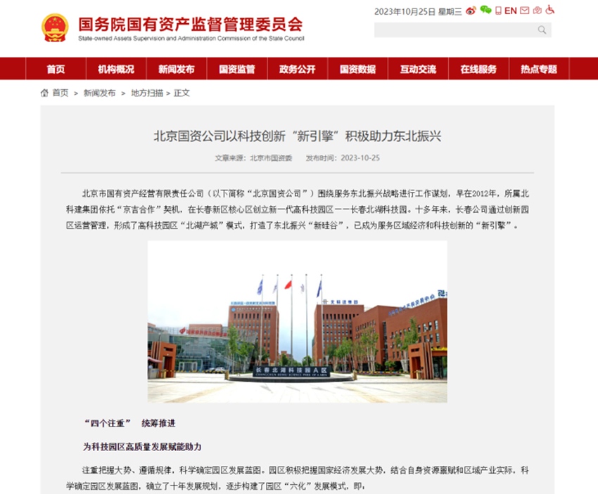 近日,國務院國資委刊文,點贊北科建·北湖科技園以科技創新“新引擎”助力東北振興。北科建·北湖科技園是北科建集團在北京國資公司的統籌指導下,圍繞服務東北振興戰略進行深度工作謀劃,憑借“京吉合作”契機,依托吉林省和長春新區的科教和產業資源,在長春新區核心區創立的新一代高科技園區。十多年來,北科建長春公司通過創新園區運營管理,形成了高科技園區“北湖產城”模式,打造了東北振興“新硅谷”,已成為服務區域經濟和科技創新的“新引擎”。園區把握國家經濟發展大勢,結合自身資源稟賦和區域產業實際,經過十余年的探索形成了具有代表性的科技園區運營生動實踐。