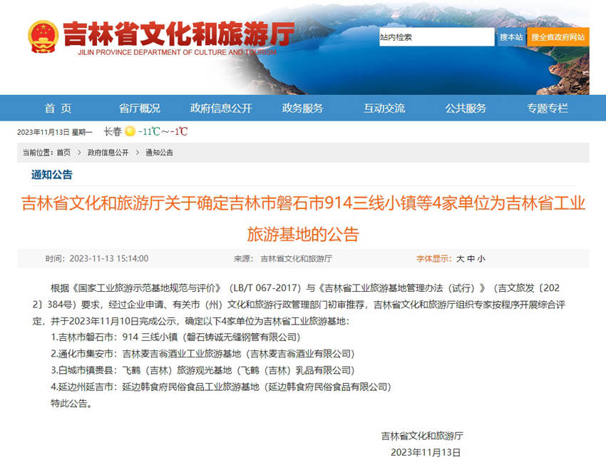 根據《國家工業旅游示范基地規范與評價》(LB/T 067-2017)與《吉林省工業旅游基地管理辦法(試行)》(吉文旅發〔2022〕384號)要求,經過企業申請、有關市(州)文化和旅游行政管理部門初審推薦,吉林省文化和旅游廳組織專家按程序開展綜合評定,并于2023年11月10日完成公示,確定吉林市磐石市:914 三線小鎮(磐石鑄誠無縫鋼管有限公司);通化市集安市:吉林麥吉翁酒業工業旅游基地(吉林麥吉翁酒業有限公司);白城市鎮賚縣:飛鶴(吉林)旅游觀光基地(飛鶴(吉林)乳品有限公司);延邊州延吉市:延邊韓食府民俗食品工業旅游基地(延邊韓食府民俗食品有限公司)為吉林省工業旅游基地。