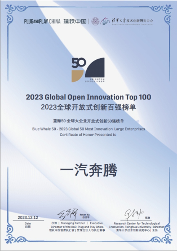 12月12日,由清華大學技術創新研究中心聯合璞躍中國發起的首個以開放式創新為主體的全球論壇“2023全球開放式創新論壇”在上海舉辦。期間,備受關注的“全球開放式創新百強”榜單正式發布,長春新區企業一汽奔騰轎車有限公司(以下簡稱一汽奔騰)與優秀產業領袖一起入選“藍鯨50·全球大企業開放式創新50強”榜單,將進一步引領帶動長春新區先進裝備制造產業高質量發展。
